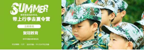 聚冠欢乐成长夏令营多年引入部队正规军事化管理,让队员们体验别样的军人生涯。军事训练,通过部队的编制与训练模式以及日常生活要求,让营员们在夏令营学会严谨的军人作风,塑造军人气质,旨在培养营员们在今后的生活中坚韧的意志、严谨的作风、无畏的精神。